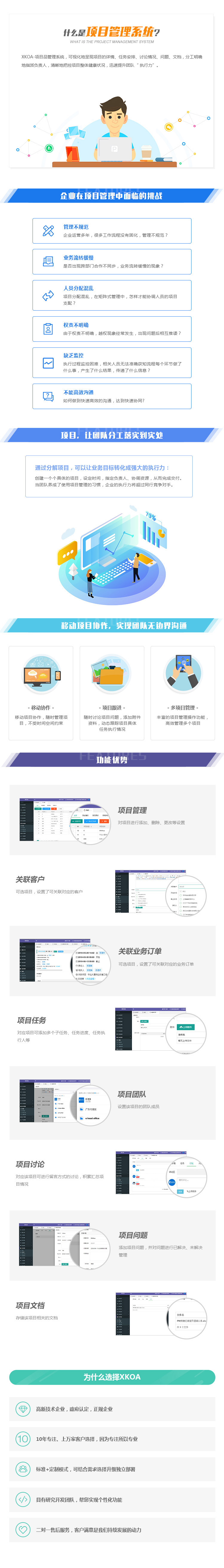 XKOA-项目品管理系统,可视化地呈现项目的详情、任务安排、讨论情况、问题、文档,分工明确地指派负责人,清晰地把控项目整体健康状况,迅速提升团队“ 行力”。